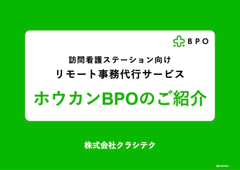 この資料では、訪問看護ステーションの事務作業をゼロにする仕組みや、ホウカンBPO特徴について、わかりやすく解説します。